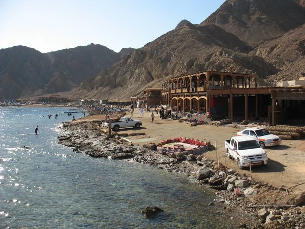 Až k Blue hole jezdí taxikáři z Dahabu cestou necestou a zastaví je až skalní výběžek kousek za Blue hole. Když vylezete na tenhle výběžek, projdete kolem několika pomníčků potápěčů, kteří již Blue hole navštívili (a už se nevrátili), pak tu díru krásně uvidíte svrchu. Široký korálový reef má v sobě najednou otvor, no spíš díru značně nepravidelných tvarů, odhadem tak 80 metrů v průměru.