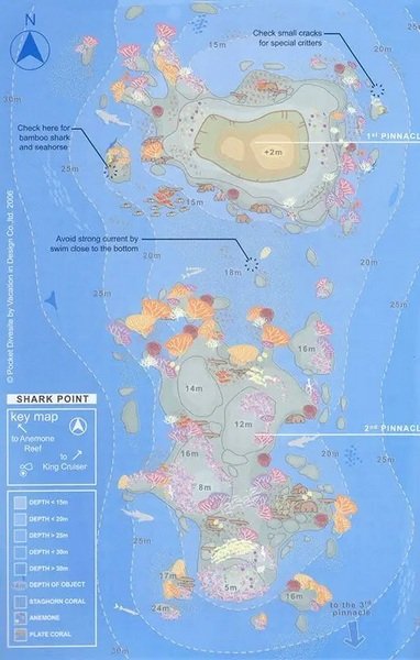 2. Se nachází cca 20m od 1. přesně na jih, pokud je pěkná viditelnost 20m, je možné vidět dvojku přímo z jedničky a přeplavat bez problému, prostor pro přeplavání je v cca 16-18m. Vrchol pinnacle je v cca 5m, maximální hloubka 18-20m. Hned na začátku se nacházejí giant barrel sponge až 2m vysoké a pak na východní straně, spousty gorgónií o průměru několika metrů, nejvíce se jich pak nachází mezi 2 a 3. Západní část je pak spíše stěny, porostlé opět korály, opět se spoustou ryb. U vrcholu v cc 5-6m je asi jediné místo kde je možné dokončovat bezpečnostní zastávku v zákrytu proti proudu.