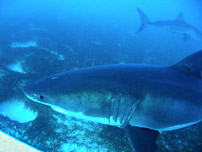 Na nic jsme nečekali a začali dodržovat stanovený plán, jak dostat "bělouše" co nejblíž. Osvědčená technika nezklamala. V jednu chvíli kolem klece kroužili tři žraloci. Bouchání do klece je evidentně dráždilo. Zkoumavě kroužili kolem klece, dalo se jich i dotknout. Při fotografování jsem se jednou nechal unést blízkostí žraloka natolik, že jsem si ani nevšiml jeho kolegy. Partner v kleci mě pohotově zatáhl zpět. Podařilo se nám žraloky vyprovokovat natolik, že jeden z nich atakoval i klec. Zuby zaskřípěly po kleci, žralok sebou cukl a pokračoval dál. Několik minut kroužili v těsné blízkosti. Před očima se mi vybavila scéna z filmu "Muž z Acapulca", kde žralok navštívil telefonní budku, ve které byl Belmondo vhozen do moře. Něco podobného by se stalo při otevření bočních dveří klece. Různých scén se mi vyjevovalo více...