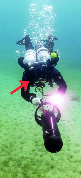 Jeden ze způsobů tažení záložního skútru. Pokud je to z hlediska stability potápěče možné, měly by být paty a ploutve u sebe.