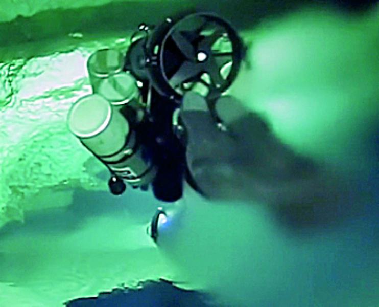 Řídíme pravou rukou, svítíme levou. Potápěč musí mít dostatečně zakloněnou hlavu. Jinak hrozí nebezpeční nárazu. © Andrea Kiss