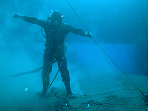 Po krátké, 14 hodinové cestě na lokalitu se loď chystá na zahájení potápění. Naše loď je DSV DP kategorie, tzn. že dokáže pomocí GPS a dalších navigačních pomůcek držet fixní pozici. Znamená to také, že se přední i zadní šrouby lodi neustále točí, což představuje podstatné riziko pro hadice potápěčů. Na DP lodích se potápění většinou řeší tak, že se z boku lodi spustí ke dnu těžké závaží zavěšené na ocelovém laně. Na umbilicalu potápěče je potom řada karabin, které tender přiklipává k ocelovému lanu. První klip je 75 feetů, což je bezpečná vzdálenost, aby ani na hladině neměl potápěč šanci dostat se k blízkosti šroubů. Na dně má potom potápěč možnost vzdálit se horizontálně od závaží zhruba těch 75 feetů. Když potřebuje víc, pohneme lodí. Na zádech má potápěč vedle bailout bottle ještě vysílač a loď dokáže udržovat od potápěče danou vzdálenost.
