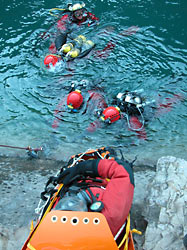 Speleologická záchranná služba České speleologické společnosti předváděla, co dovede při transportu zraněného. Lom Velká Amerika byl na pár hodin zpřístupněn potápěčské veřejnosti.