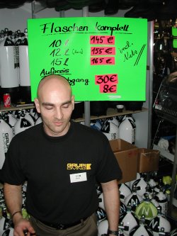 PADI mělo vlastní stánek, pěkný, plný barevných prospektů, ale jen jeden. CMAS byl viditelný na řadě míst. Opravdu viditelný - od letáčků na stolech po velké vlajky visící nad řadou stánků. Neznám německý trh s potápěčskými kursy, ale působilo to na mne tak, že CMAS nabízejí v podstatě všichni a PADI se snaží prosadit. Myslím, že se máme ve Svaz potápěčů kde inspirovat. Své zastoupení měla i řada dalších výcvikových organizací, jenom UDI nějak chybělo...