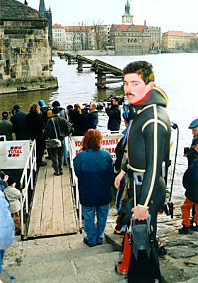 Sraz byl na malostranské straně Karlova mostu, na Kampě, u přístaviště parníků. K zanoření do vody teplé nějaké 2 °C, s viditelností slabého půl metru, se odhodlalo jen pár skalních. Přiznávám, že jsem k nim nepatřil. Dokonce ani přítomné vodnici se do vody nějak nechtělo. Než vodu, tak má asi raději zelený peprmintový likér, který nabízela okolostojícím. Zato Honza Jeřábek má asi chladnou vodu rád, jelikož do ní vlezl hned dvakrát pouze v plavkách. Poprvé byla asi motivem sázka o láhev šampaňského, podruhé snaha smýt ze sebe tento lepivý mok.