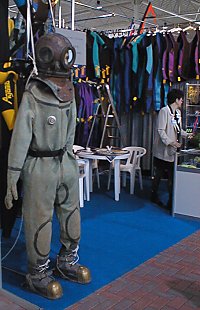 | Řada potápěčských škol a prodejců potápěčské techniky předváděla, co umí. Skafandr s mosaznou přilbou nebyl u Agamy bohužel na prodej. |