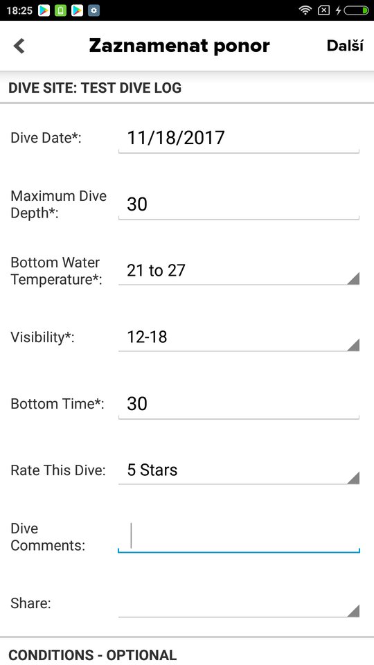 Nepochopil jsem pro mě nelogické zadávání lokality, buď na mapě nebo ručně. Jde vidět, že je aplikace nachystaná pro rekreační potápění. Lze zadat opakovací skupiny a v jakém režimu byl ponor proveden, jestli s průvodcem nebo s instruktorem apod. Data lze sdílet pouze exportem do csv souboru nebo zálohou přes paměťovou kartu, což je na dnešní dobu nedostačující. Aplikace již není 5 let aktualizovaná.