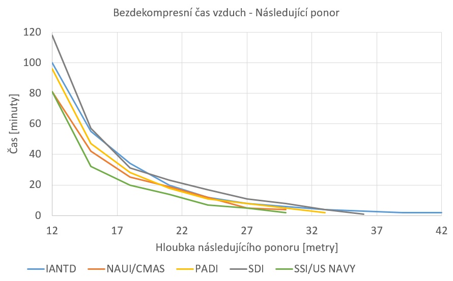 Vyhledal jsem tabulky pro bezdekompresní ponory na vzduch pro nulovou nadmořskou výšku u nás nejrozšířenějších agentur a podrobil je detailnější analýze. Rozhodl jsem se nepoužít jedinou hodnotu, nýbrž vzít nejlépe celou škálu a porovnat rozdíly v co nejširším spektru hloubek a časů. Nejprve jsem porovnal bezdekompresní časy v jednotlivých hloubkách pro první ponor. Po té jsem chtěl vedle sebe postavit zbytkový čas dusíku pro opakovaný ponor. Ale vzhledem k tomu, že pro druhý ponor již záleží na expozici, kterou ovlivňuje čas i hloubka nebylo možné jednoduše vizualizovat celé spektrum hodnot. Vybral jsem proto ponor ze střední části tabulky. Bylo by vhodné vzít ještě vzorek z krajních hodnot, ale vzhledem k tomu, že rozdíly byly již zde markantní, od dalšího srovnání jsem upustil.