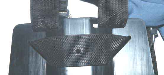 Nerezová zádová deska váží cca 3kg a může kompenzovat váhu pozitivních lahví, nebo pot. obleku a umožňuje připevnění V-zátěže mezi dvoumontáž lahví.