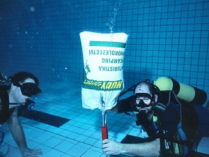 Text a zpracování Tomáš Sládek, foto Jan Hájek, metodické vedení Miroslav Kukliš (instruktor se třemi igelitkami), na měření dále spolupracovali Zdeněk Šraier a Dan Frolec, prostor pro test a částečně vzduch při testu spotřebovaný poskytl potápěčský klub Blue-cell v prostorách Plaveckého bazénu v Podolí.