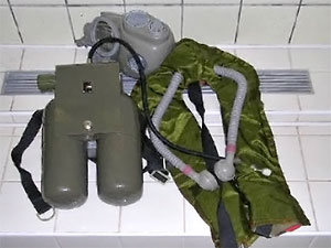 Další součástí je záchranná vesta složená v obalu uzavřeném na suchý zip, ze kterého se při nafouknutí sama uvolní. Vestu nelze odpustit, je vybavena pouze přetlakovým ventilem a dále kolíčkovým uzávěrem známým z nafukovacích matrací.