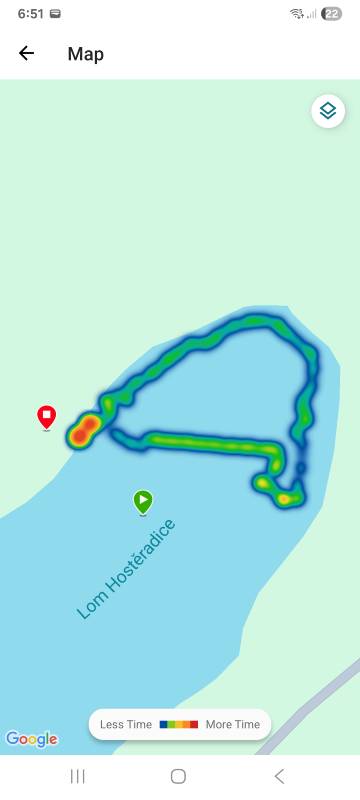 Přemýšlel jsem, že by bylo dobré uložit historii polohy potápěče. Tu jsem později našel v logu formou heat mapy. V některých okamžicích mi přišlo, že zobrazovaný pohyb je příliš přímočarý, to bylo patrně způsobeno ztrátou signálu. Podobně trasa ukazovala, že jsme plavali "na břehu", toto naopak přikládám zanedbané kalibraci bóje před ponorem.