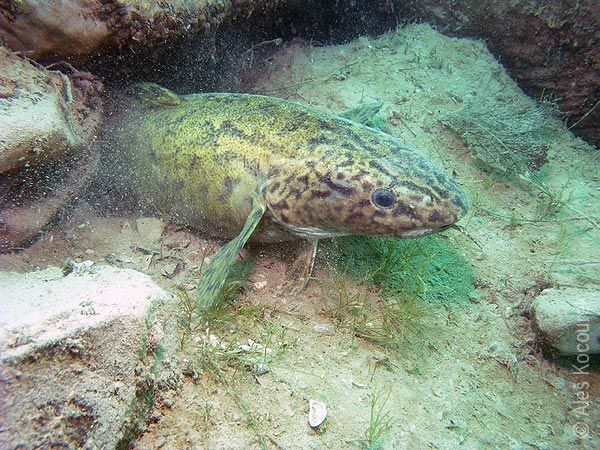 Charakteristickým znakem je jediný fous uprostřed brady. Břišní ploutve má před prsními. Zbarven je dosti proměnlivě, od šedohnědé barvy do černozelené, s nápadným tmavým mramorováním na těle i na ploutvích.