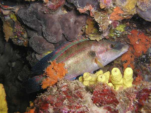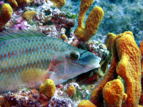 Popis: Největší a asi nejpestřejší pyskoun Středozemního moře. Má klasický rybí tvar těla s výrazným rypcem. Na těle má obvykle tři podélné hnědavé pruhy a nápadnou černou tečku uprostřed ocasního násadce. Pohlaví se od sebe liší barevně i velikostí, samci bývají větší a obvykle pestřejší. V době páření mají samci velmi výrazné zbarvení: zelenavý nádech těla a modře lemované ploutve s červenými skvrnami.